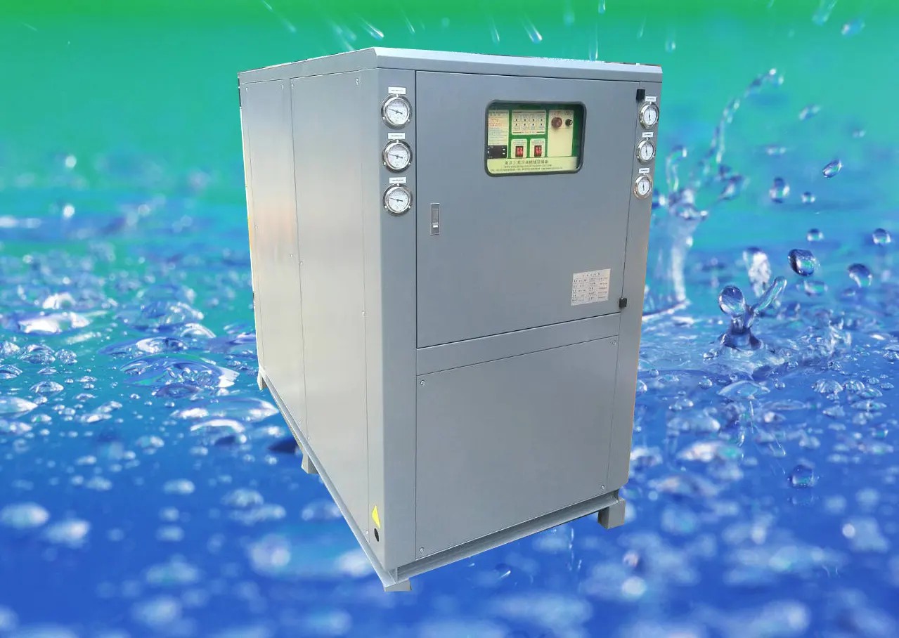 水冷式冷水机是利用壳管蒸发器使水与冷媒进行热交换,冷媒系统在吸收水中的热负荷,使水降温产生冷水后﹐通过压缩机的作用将热量带至壳管式冷凝器,由冷媒与水进行热交换﹐使水吸收热量后通过水管将热量带出外部的冷却塔散失(水冷却))